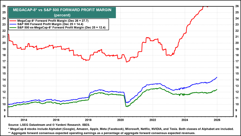 Higher earnings growth supports and may even justify richer valuations. The challenge arises when expectations outpace a company’s ability to grow, and investors are very optimistic about the future of AI companies. In fact, expected forward profit margins are literally off the charts, as indicated in the chart below of margins of mega cap technology stocks versus the rest of the S&P 500 (Yardeni Research). Yardeni includes Netflix along with the Mag 7 in his calculations to come up with what he calls the “MegaCap 8.”
